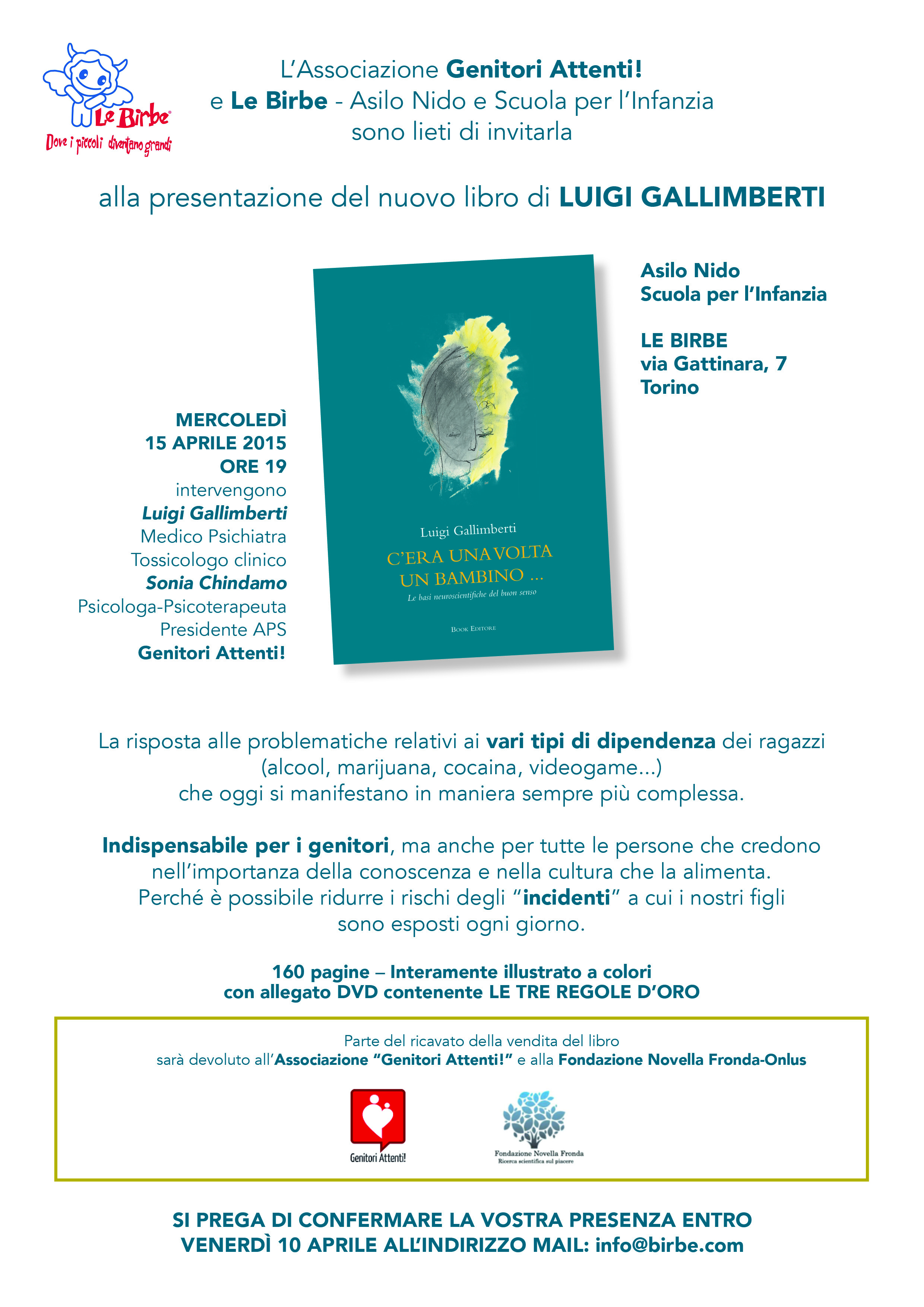 L’Associazione Genitori Attenti! e "Le Birbe" di Torino (nido e scuola dell'infanzia) promuovono per il 15 aprile un incontro con lo psichiatra Luigi Galimberti, che presenterà il suo libro C'era una volta un bambino.
