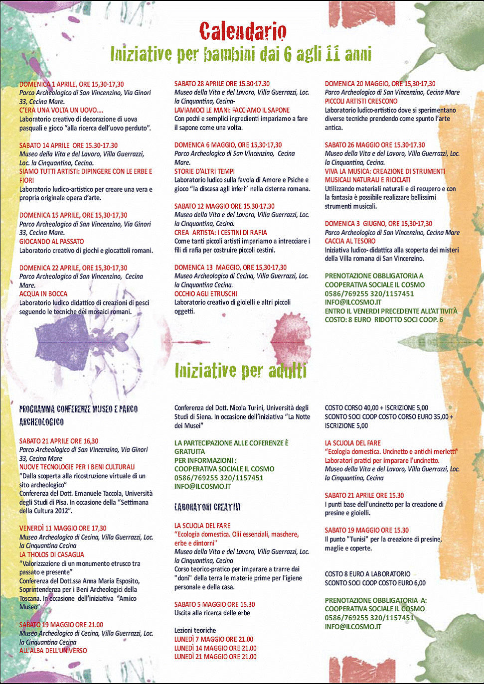 Laboratori, visite guidate all'aperto ed attività per bambini da 6 a 11 anni organizzati dal Museo civico archeologico di Cecina, il Parco archeologico di San Vincenzino, il Museo della vita e del lavoro della Maremma settentrionale.