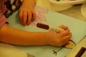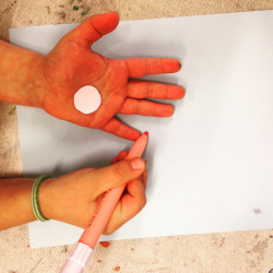 Una volta disegnata e colorata la mano, sarà possibile incollare il fiocco di neve. Darò ad ogni bambino un altro cerchio e da questo potranno partire per raffigurare la persona che riceverà il dono, il fiocco di carta. Proverò a spiegare ai bambini, liberi di rappresentare lo schema corporeo in base alle loro capacità, che il loro disegno (la composizione) sarà (avrà un taglio) come visto esattamente dai loro occhi. La mano sarà grande come lo è in realtà e la persona, a cui fare il dono, sarà piccola, perché lontana.