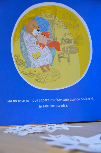Quando tutto finalmente si ricopre di bianco, il paesaggio si fa magico e lo scoiattolo vuole uscire, ovviamente con l’orso, ma nulla da fare! L’orso si ammala. È così che il piccolo farà esperienza di cosa sia la neve da solo e preso dall’entusiasmo e dalla nostalgia per il suo caro orso, decide di donargli il fiocco di neve più speciale. Scopre ben presto e suo malgrado, che un fiocco di neve dura solo un attimo e che non potrà donarlo quindi all’orso, non potrà portargli la neve.