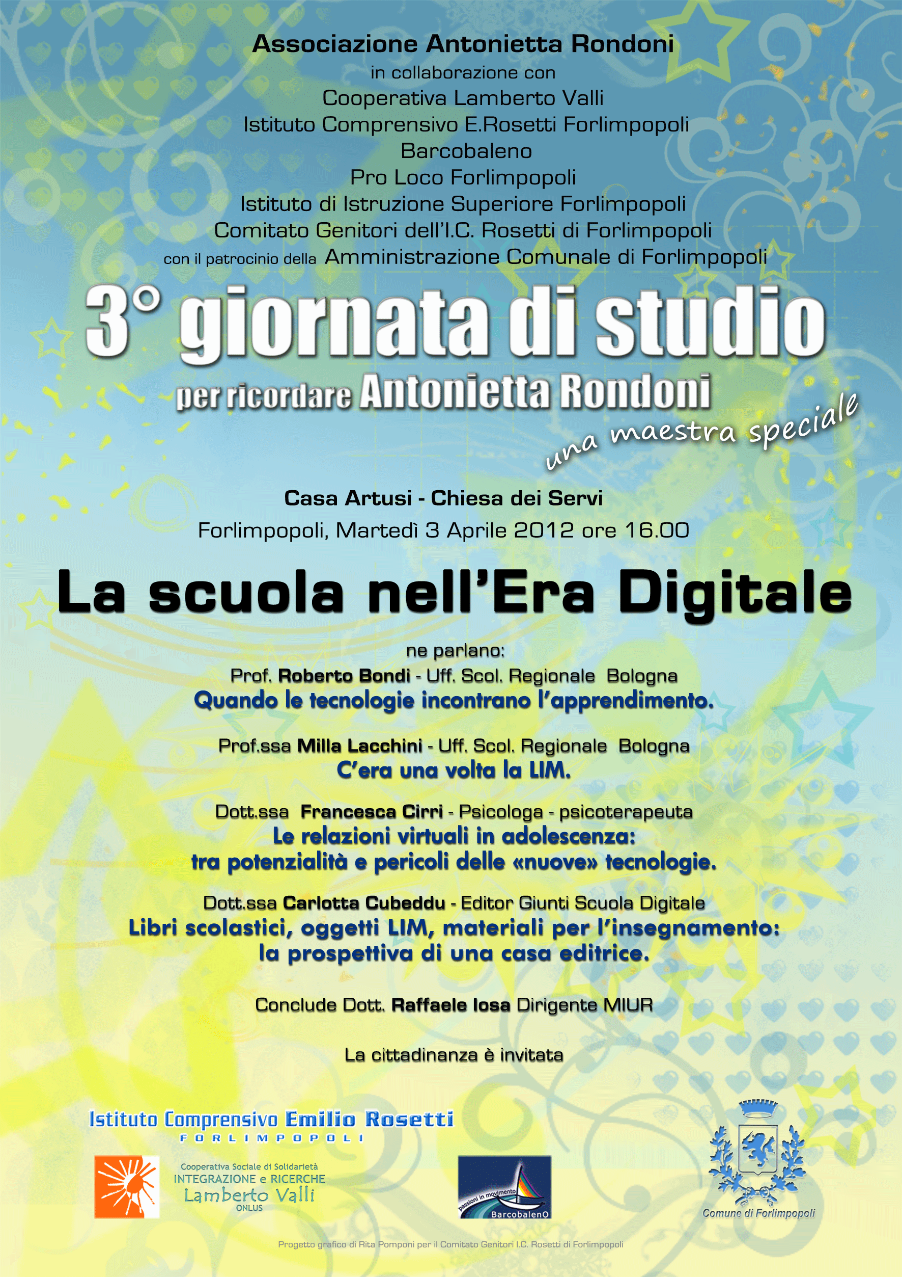 Per il 3 aprile, a partire dalle ore 16.00, presso Casa Artusi-Chiesa dei Servi, l'Associazione dedicata all'insegnante Antonietta Rondoni organizza un convegno dedicato a scuola e nuove tecnologie. Parteciperanno esperti del settore. Il Convegno gode del patrocinio della Amministrazione Comunale di Forlimpopoli, della collaborazione di associazioni culturali, e sarà considerato come giornata di aggiornamento dall'Istituto Comprensivo di Forlimpopoli.