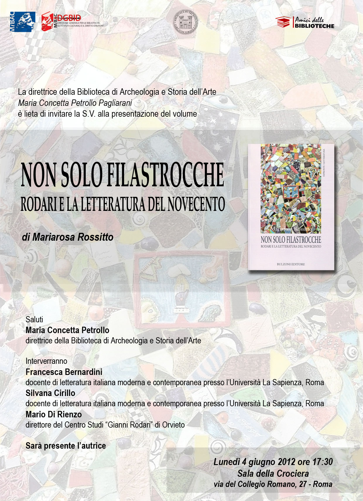 Lunedì 4 giugno, alle 17.30, presso al Sala della Crociera (via del Collegio Romano, 27), si terrà la presentazione del volume "Non solo filastrocche. Rodari e la letteratura del Novecento", di Mariarosa Rossitto. Sarà presente l'autrice.