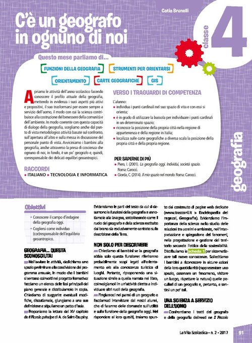 1 percorso didattico per: conoscere il campo d’indagine della geografia oggi; cogliersi come individuo (cor)responsabile dell’equilibrio geoantropico; orientarsi utilizzando i punti cardinali; orientarsi utilizzando la bussola; orientarsi sulla pianta del quartiere/paese in base ai punti cardinali; localizzare su carte geografiche a diversa scala la posizione della propria città e della propria regione; riconoscere la posizione della propria città nell’ambito della regione di appartenenza; riconoscere la posizione della propria regione rispetto all’Italia.