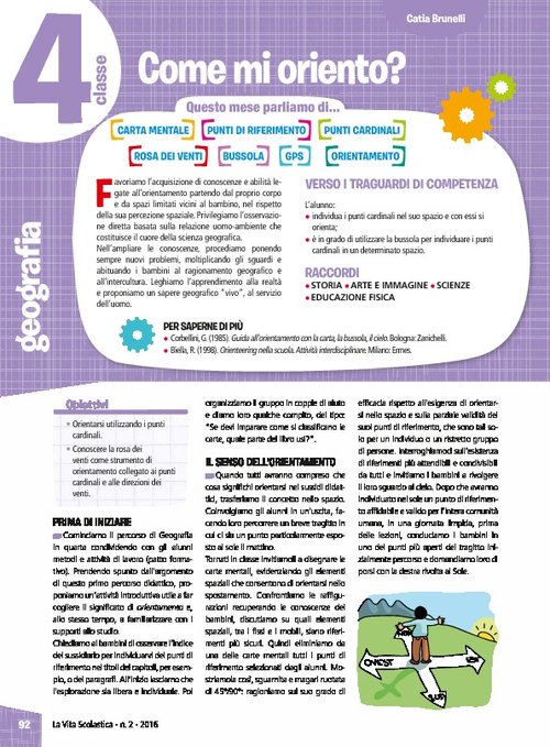 1 percorso didattico per: orientarsi utilizzando i punti cardinali; conoscere la rosa dei venti come strumento di orientamento collegato ai punti cardinali e alle direzioni dei venti; orientarsi sulla pianta del quartiere/paese in base ai punti cardinali; orientarsi utilizzando la bussola.