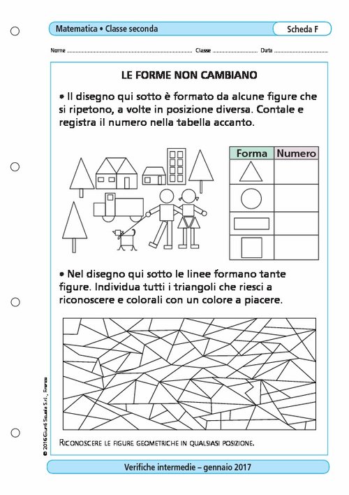 1 scheda di verifica con soluzione per lo studente. Attività: completare la tabella, osservare il disegno e individuare figure geometriche.