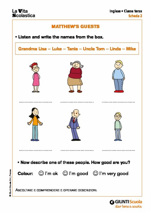 1 scheda stampabile per lo studente. Attività: listen and write the names from the box; describe one of these people.