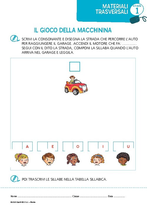 Due schede di lavoro – "Il gioco della macchinina" e "La tabella sillabica" – da utilizzare durante tutto il processo di costruzione delle sillabe, per imparare a leggerle e a scriverle.